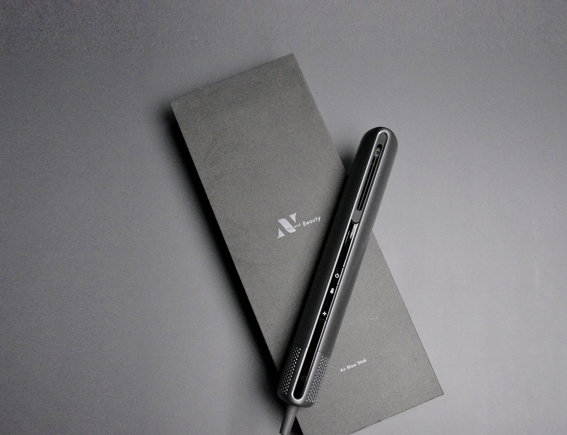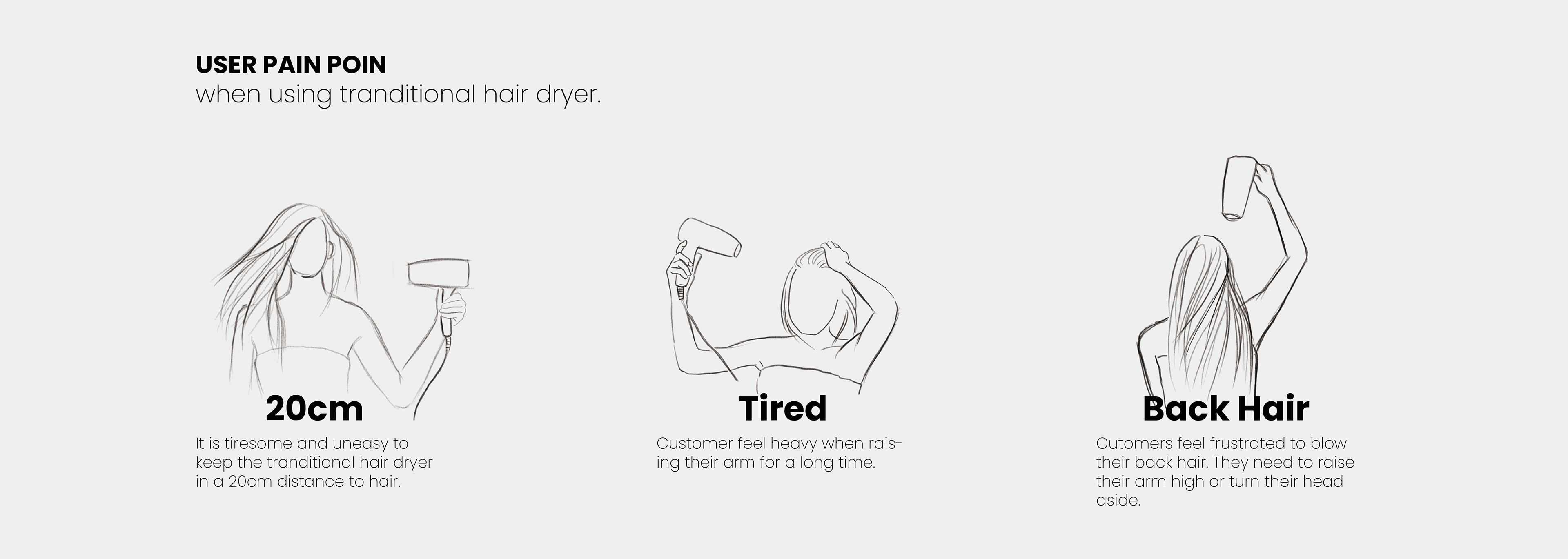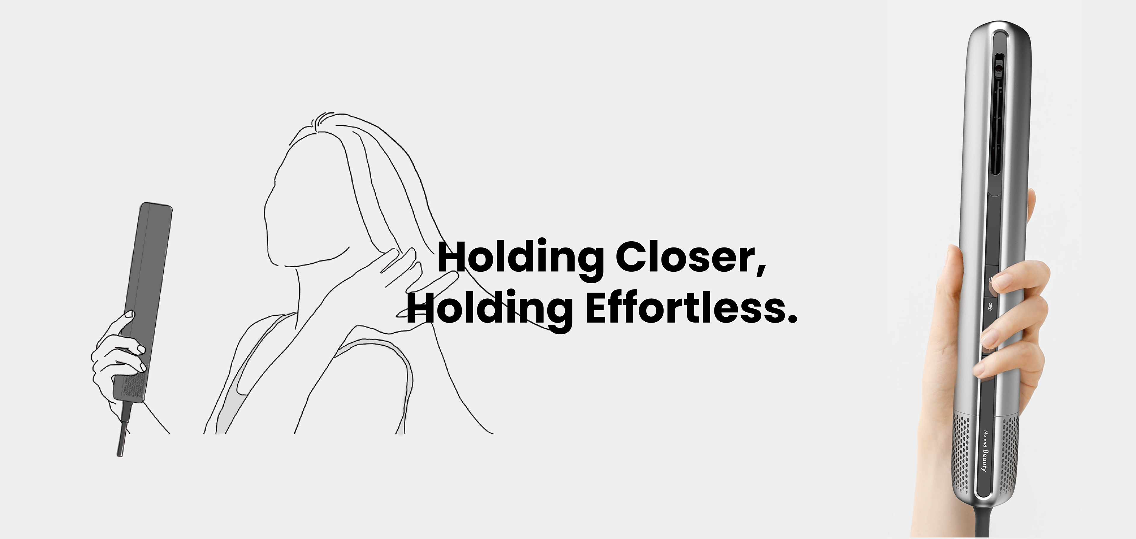 The design solves the core usability flaws of traditional hairdryers—arm strain and awkward angles. The solution is "ergonomic airflow," a principle embodied in the elongated stick form and aerodynamic triangular head.